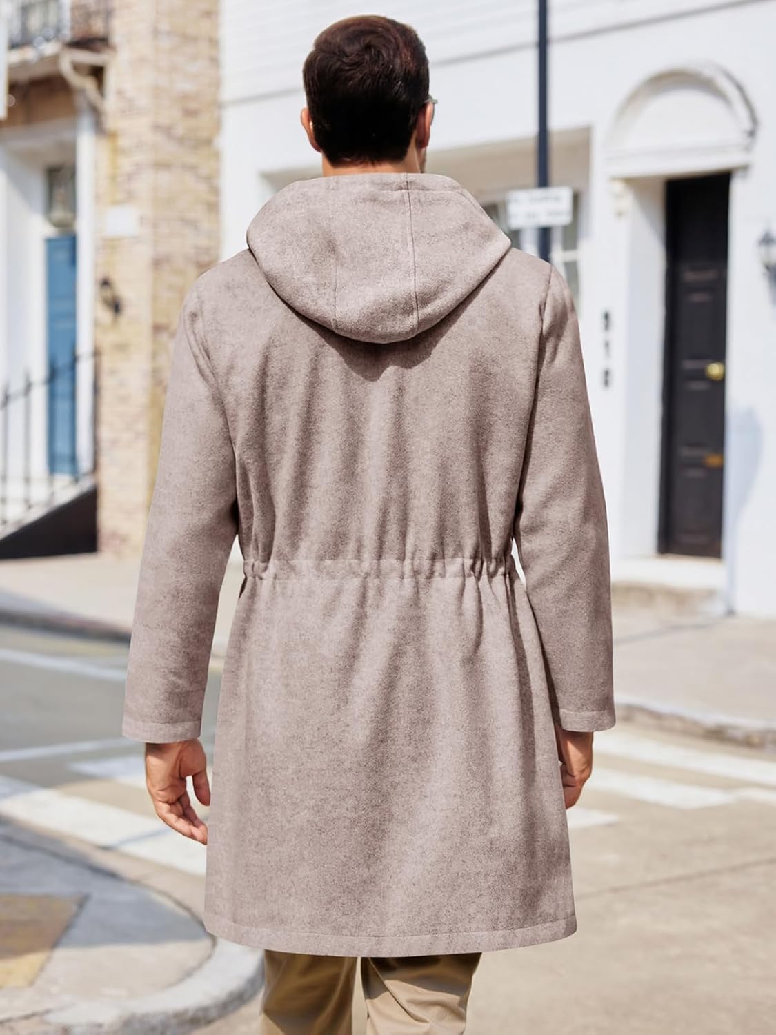 The image shows the back view of a man wearing a ZIWOCH Men’s Trench Coat. It is a wool blend coat. The color is a neutral taupe or light brown. The coat has a hoodie and a drawstring at the waist. This drawstring provides an adjustable fit. The jacket has a long length, making it a good choice for winter. The style suggests it’s appropriate for both classic business and casual wear.