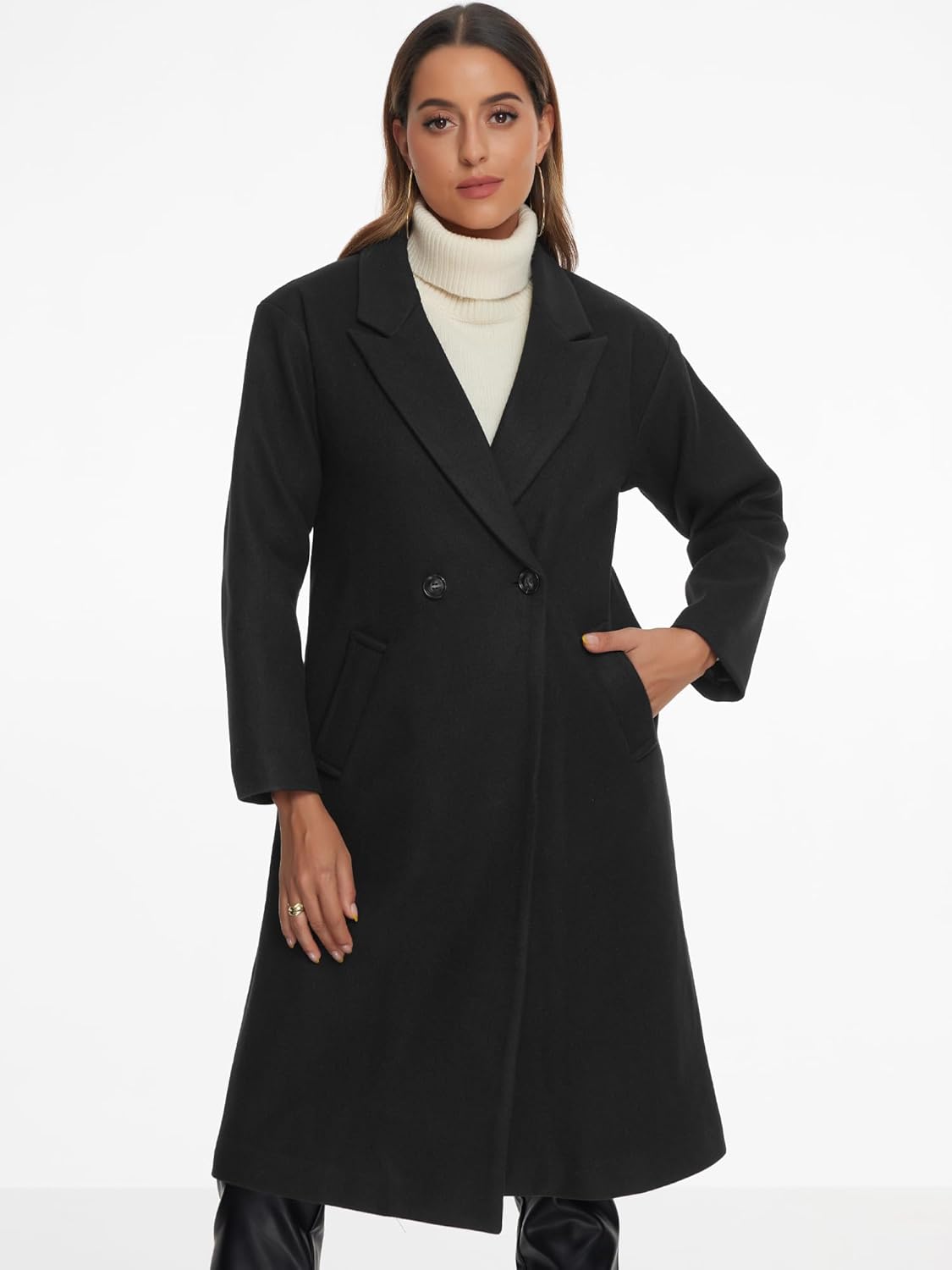A woman models the Allegra K Mid-Length Winter Overcoat. The coat is black and features a notched lapel. It has a double-breasted style with two buttons visible. She is wearing a cream-colored turtleneck sweater underneath the coat. The lower part of her outfit appears to be black pants. The image highlights the coat’s simple, elegant design suitable for winter wear.