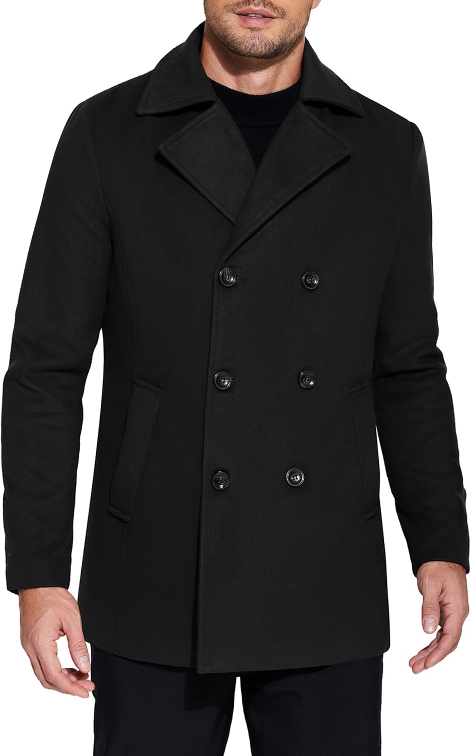 The COOFANDY Men’s Double Breasted Pea Coat is a winter overcoat featuring a classic pea coat style. This outerwear garment is designed as a short trench coat and includes a notched collar. Its double-breasted closure makes it a suitable and stylish option for cold weather.