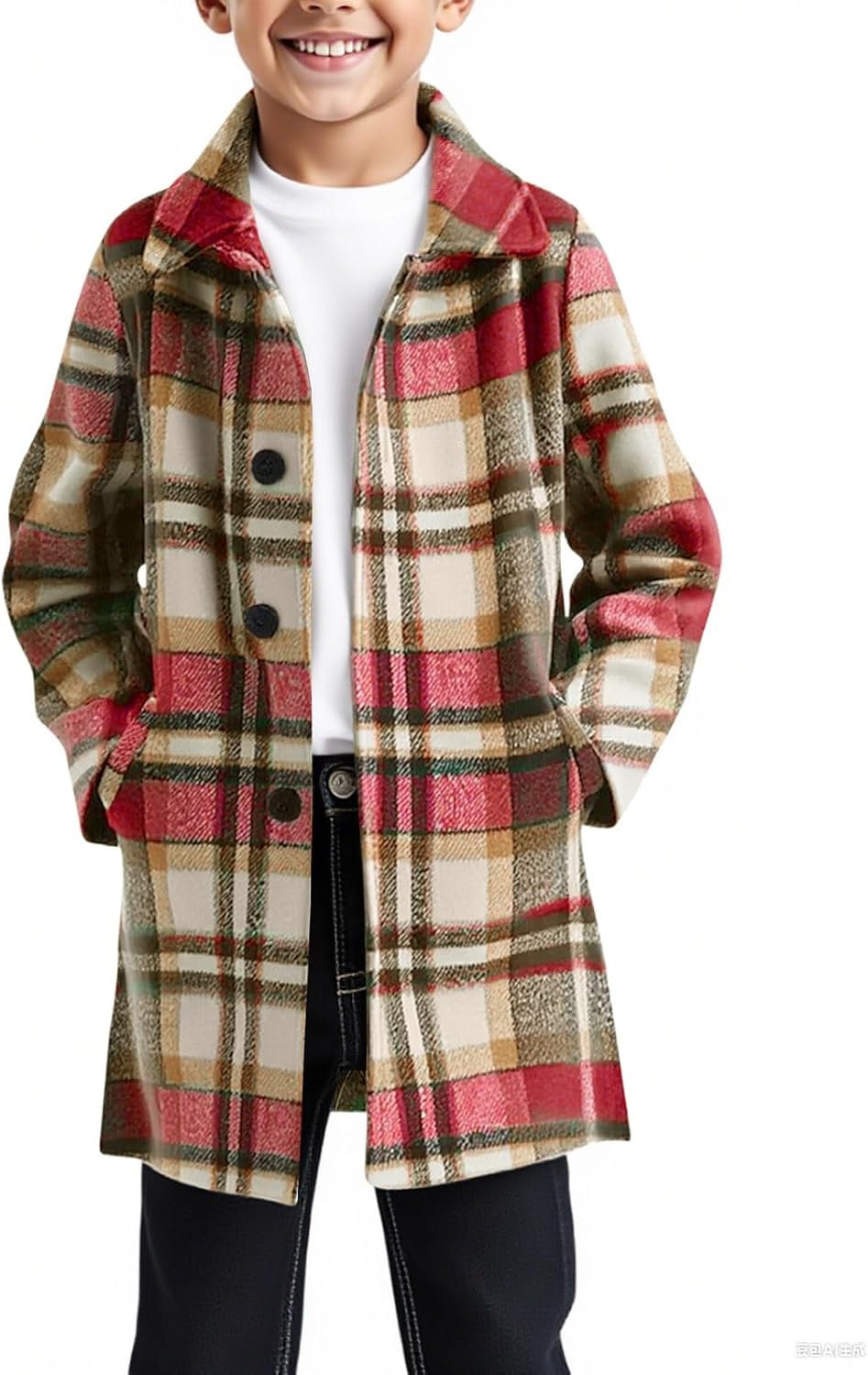 The Haloumoning Boys Plaid Dress Coat is a stylish wool blend pea coat perfect for fall. This jacket features a classic plaid design and a button-down closure. It includes functional pockets and is available for boys ranging from 5 to 14 years old.