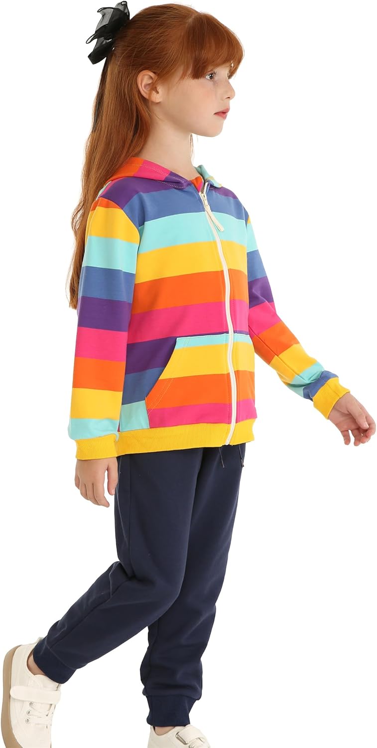 A young girl models a brightly colored jacket. The jacket is a zip-up hoodie. It features bold horizontal stripes in a full rainbow of colors. It has a yellow ribbed hem and cuffs. There’s a single front pocket. The girl wears navy blue sweatpants with the hoodie. The hoodie is designed for comfortable everyday wear. It is a vibrant piece of children’s apparel.